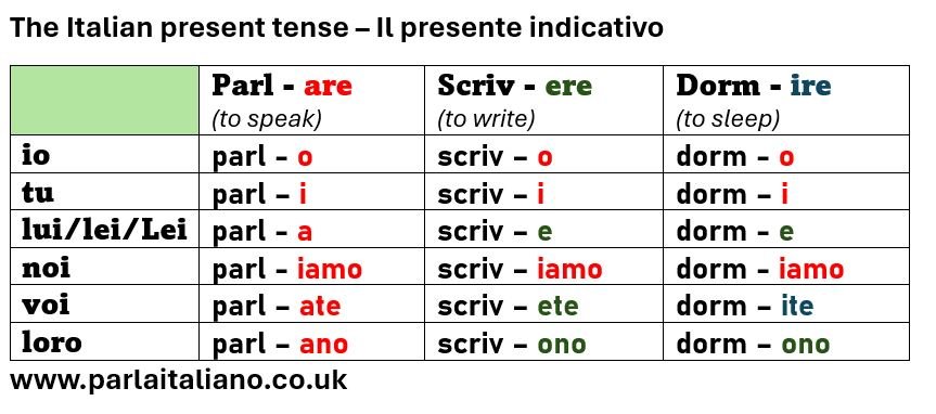 The present tense is one of the most frequently used tenses in Italian and essential for basic communication. Using an italian verb conjugation chart, verbs such as parlare, credere, and finire are displayed as io parlo, tu parli, lui/lei parla. Regular practice with this chart allows learners to quickly recall forms and use them in conversation.